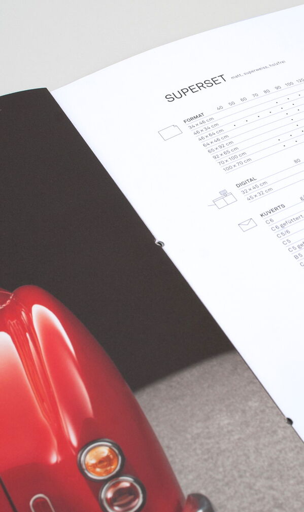 Des élastiques aux bouts argentés ont été détournés et utilisés pour la reliure de la brochure Superset. Normalement, ce type d'élastique est tendu autour des coins de pochettes pour les fermer. Le caractère individuel du support publicitaire est en outre souligné par le gaufrage de la pochette d'envoi Snow associée. Les papiers exceptionnels méritent en effet une apparence exceptionnelle.
